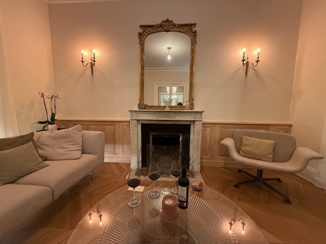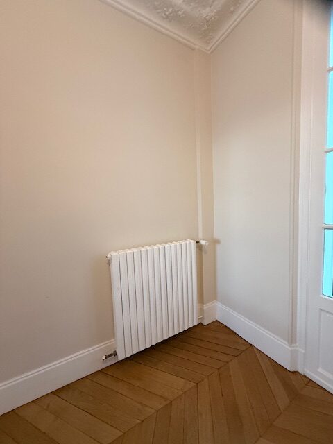 Enfin, des soubassements en boiserie, composés de trois panneaux moulurés, viennent encadrer de part et d’autre une cheminée en marbre, complétant harmonieusement l’ensemble.