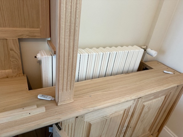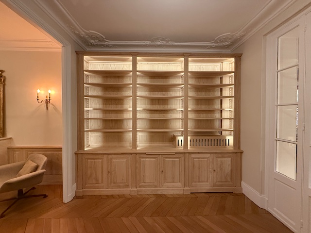 Élégante bibliothèque de parquet, conçue pour habiller un pan de mur de 332 cm de longueur tout en dissimulant un radiateur disgracieux.