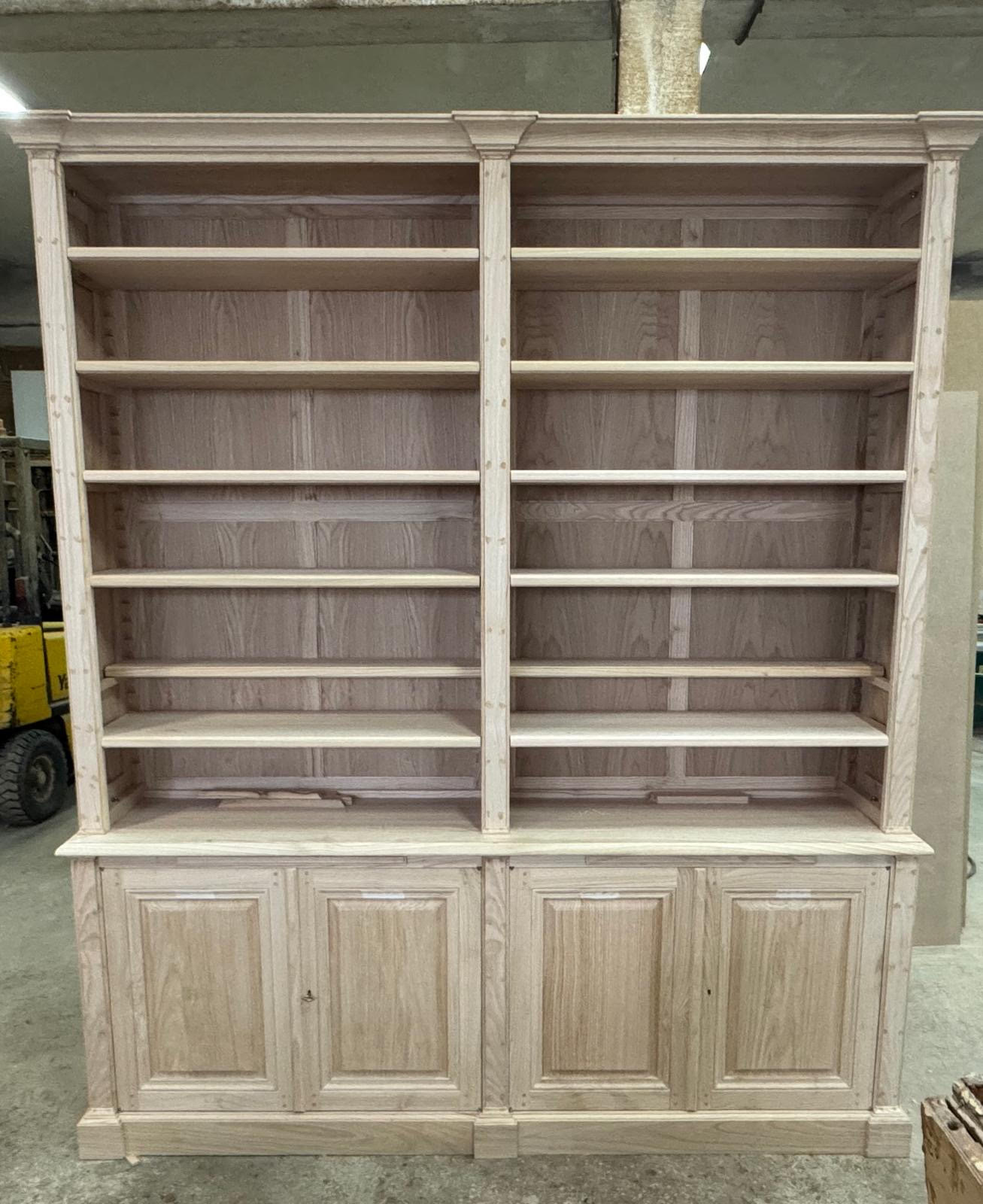 Ci-dessus, la bibliothèque en cours de réalisation à l’atelier. Chaque client reçoit des photographies de son meuble sur mesure pendant sa fabrication — un véritable gage de qualité, mettant en valeur le soin apporté à chaque détail de la commande.
