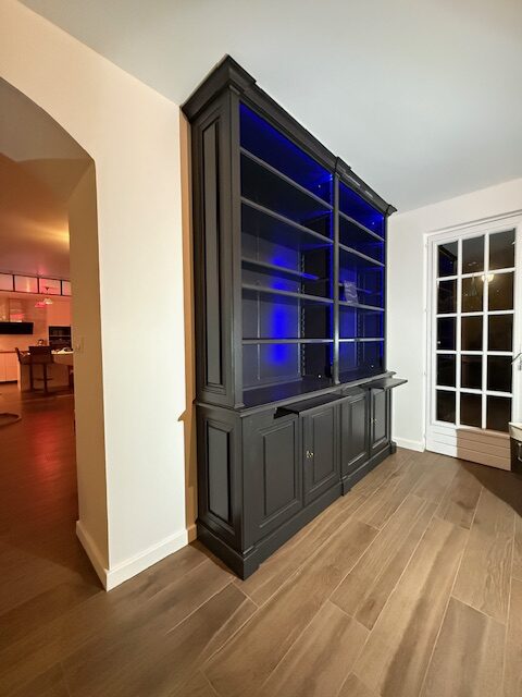 Réalisation d’une bibliothèque sur mesure allant du sol au plafond, tout en restant démontable et transportable, répondant à des critères très précis définis par les clients, notamment une corniche d’une section de 6 cm × 6 cm ainsi qu’une plinthe entièrement travaillée avec des ressauts.