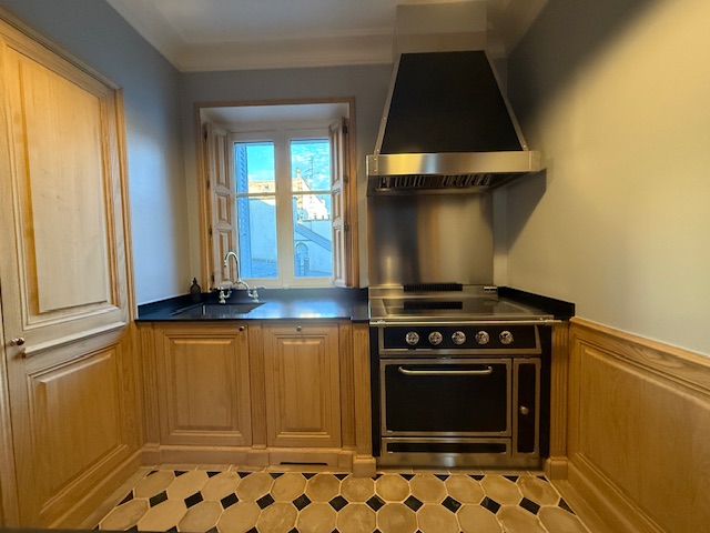 Agencement sur mesure d’une cuisine en bois naturel, avec des panneaux en châtaignier massif venant dissimuler l’ensemble des différents électroménagers haut de gamme : piano de cuisson et sa hotte, cave à vins, réfrigérateur et congélateur, lave-vaisselle.