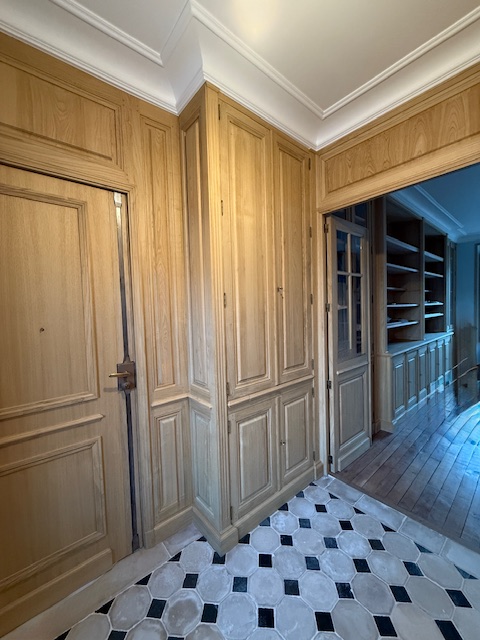 La chaleur des boiseries en bois naturel, associée à un sol en pierre de Bourgogne agrémenté de cabochons en ardoise du XVIIIᵉ siècle, confère à l’ensemble un charme indéniable et une élégance intemporelle, tout en valorisant pleinement le bien immobilier.