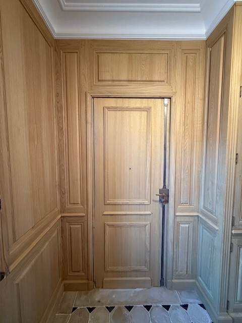 La porte blindée a été habillée de panneaux moulurés en bois, parfaitement intégrés au décor de l’entrée afin d’en préserver l’harmonie esthétique.